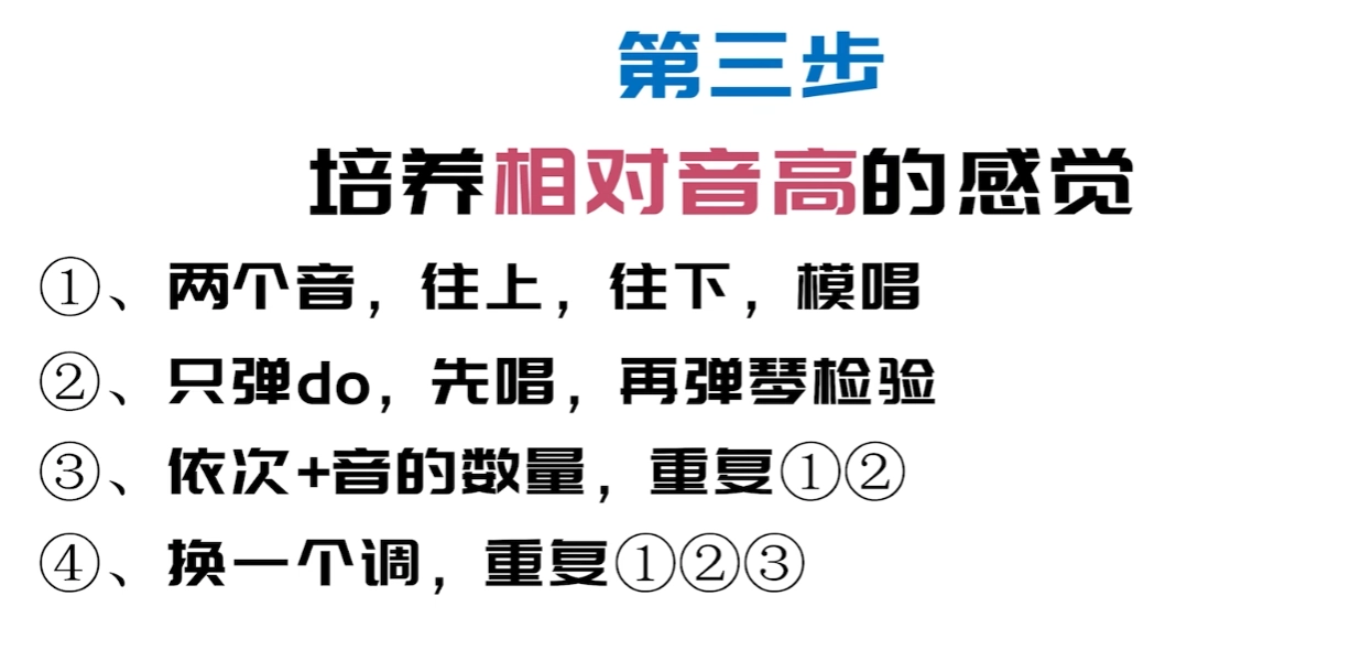 1、能够迅速唱出一个音对应的唱名 第一步 2、模唱:唱准一个音 第二步 3、培养相对音高的感觉 image.png 附:(红色标记表示高音) 训练
