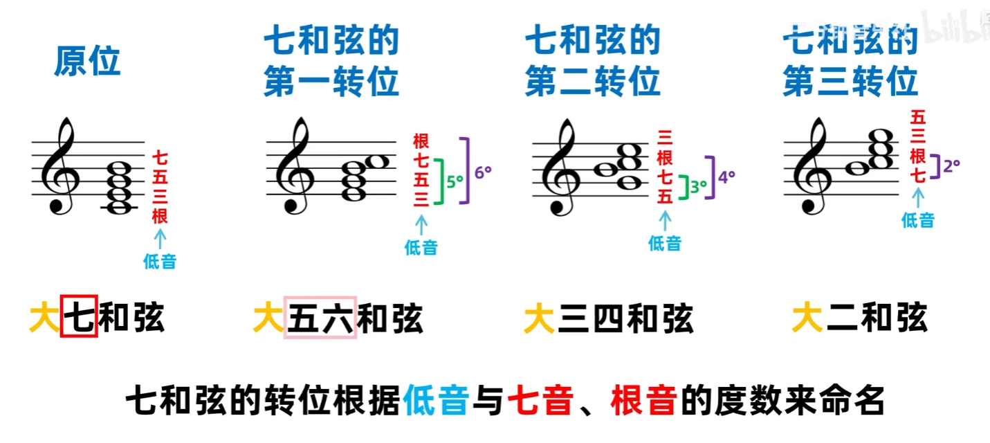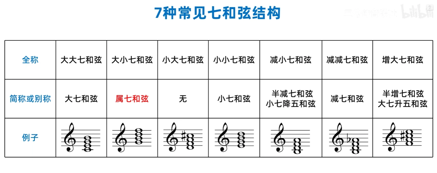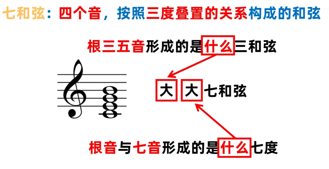 - 七和弦: 按照三度音程关系叠置起来的四个音所构成的和弦。用1、3、5、7来表示 。
