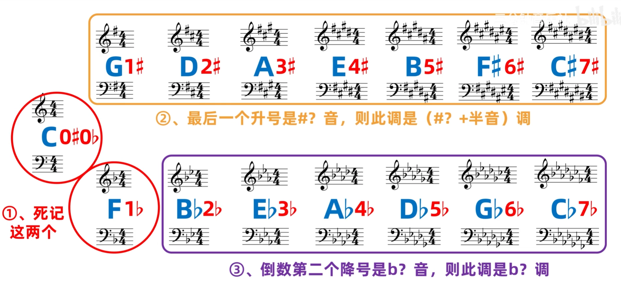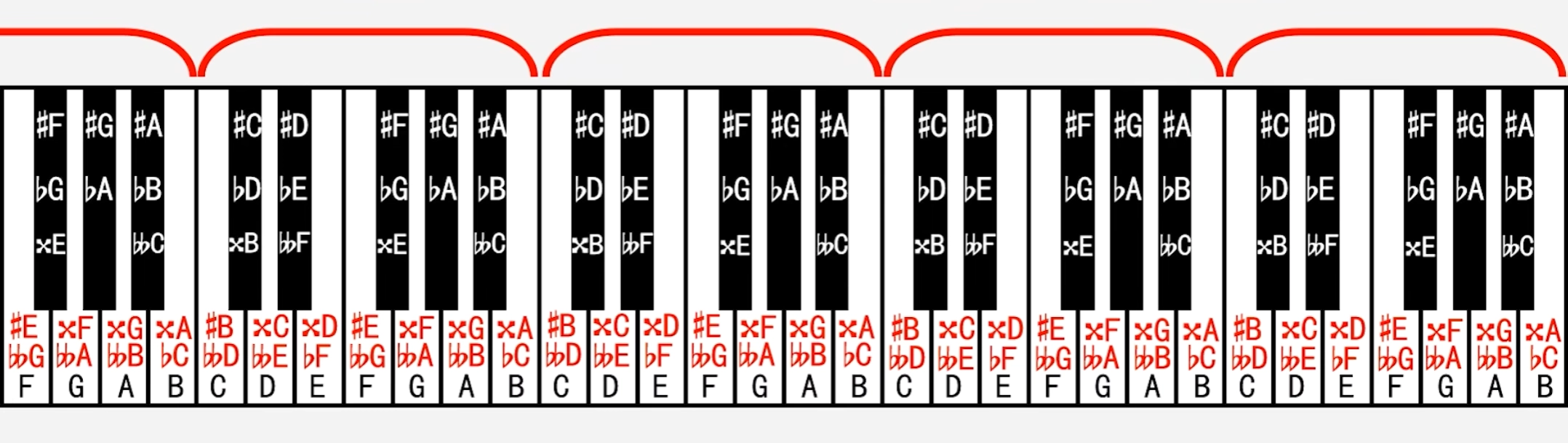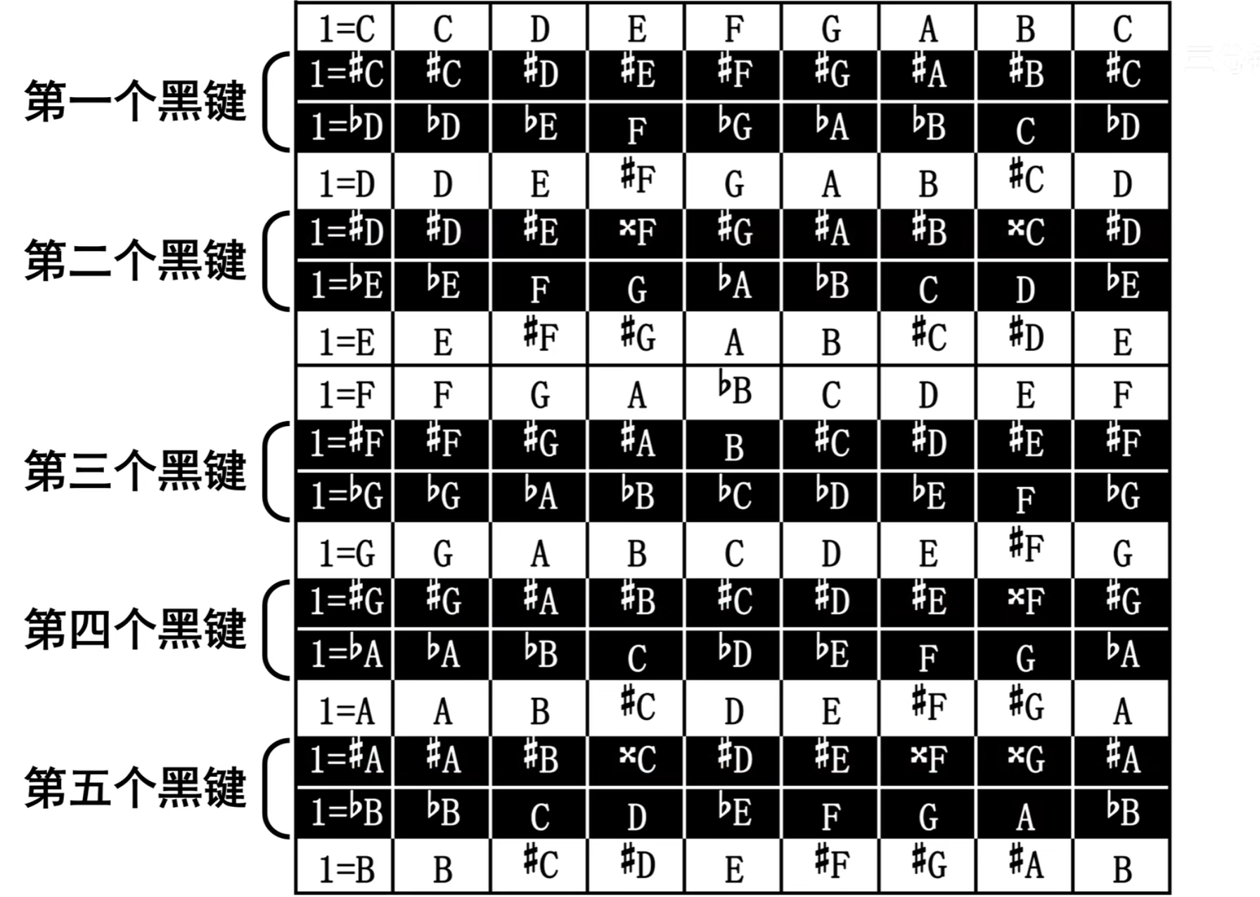 - 等音: 音高相同而记法和意义不同的音。如#C、bD,xB,这三个音在钢琴上音高是完全相同的,但记法和意义不同。可以看出,除了#G和bA只有一个等音外,其他各音都有两个等音。