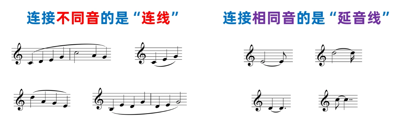 - 延音线: 记在音高相同的两个音符上的弧线,表示将两个音唱成一个音。