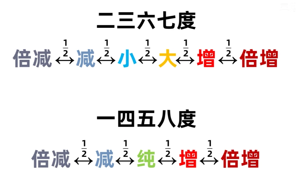 - 定律法: 确定乐音体系中各音的绝对准确高度,人们在实践中创造了各种定律法。如十二平均律,五度相生律、纯律等。