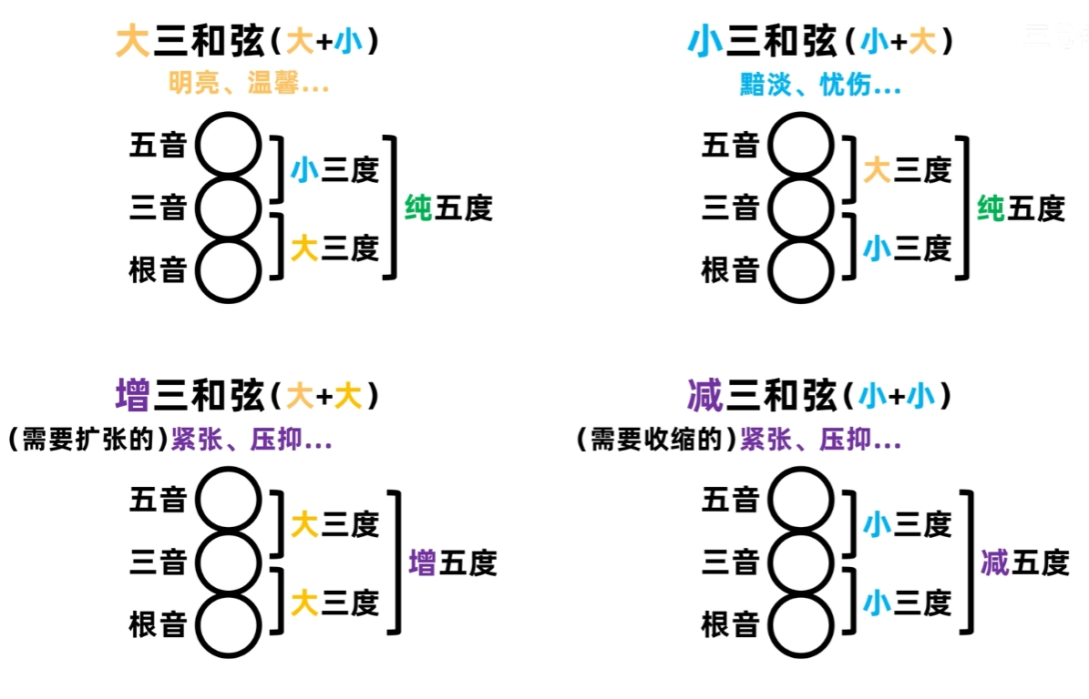 - 三和弦: 按照三度音程关系叠置起来的三个音所构成的和弦。音程排列的根音、三音、五音分别用1、3、5 来表示。